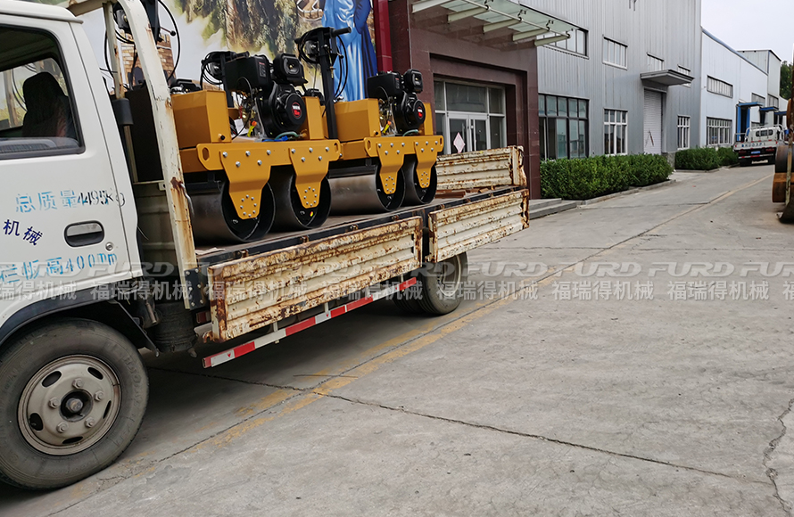 福瑞得4臺(tái)手扶雙鋼輪壓路機(jī)打包裝車發(fā)往泰安