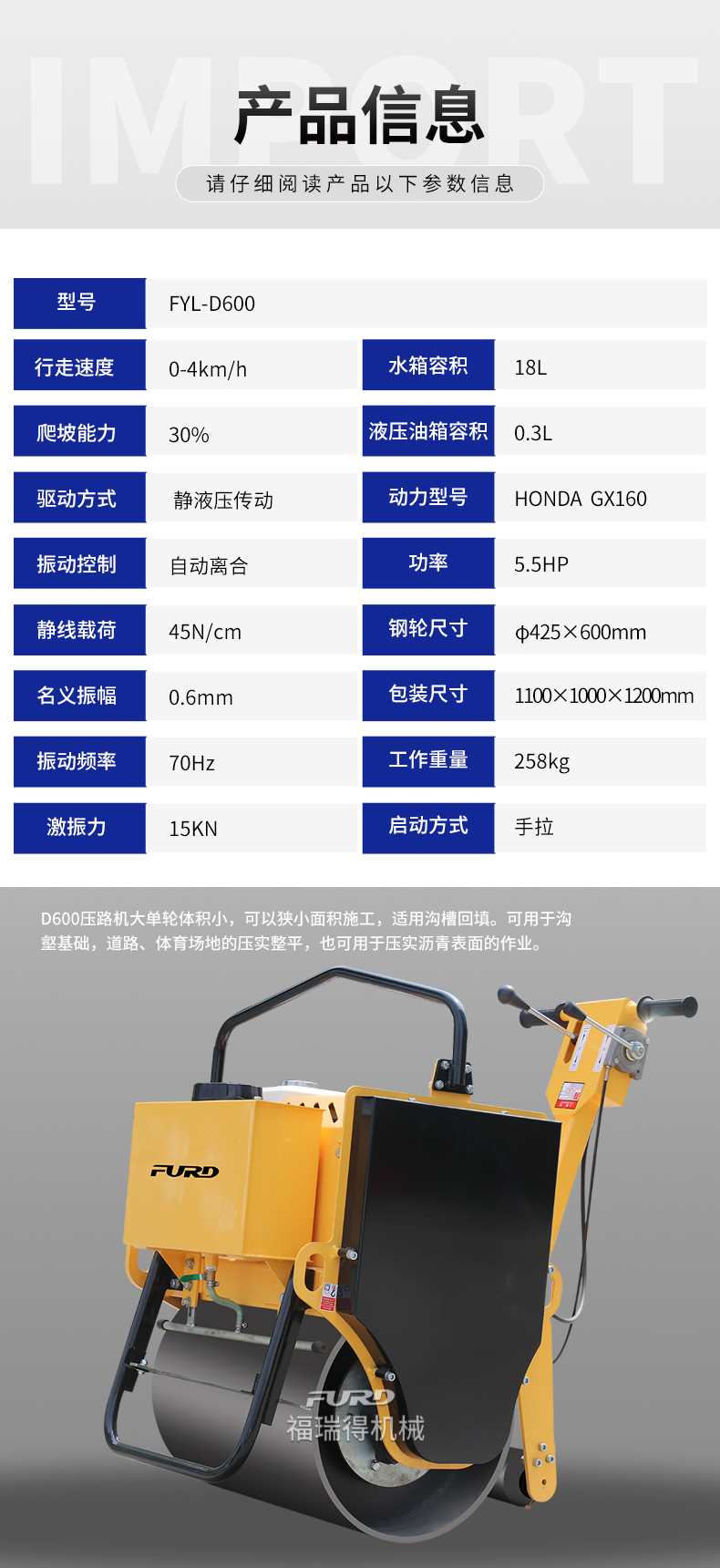 福瑞得 FYL-D600 小型手扶單輪壓路機(jī)