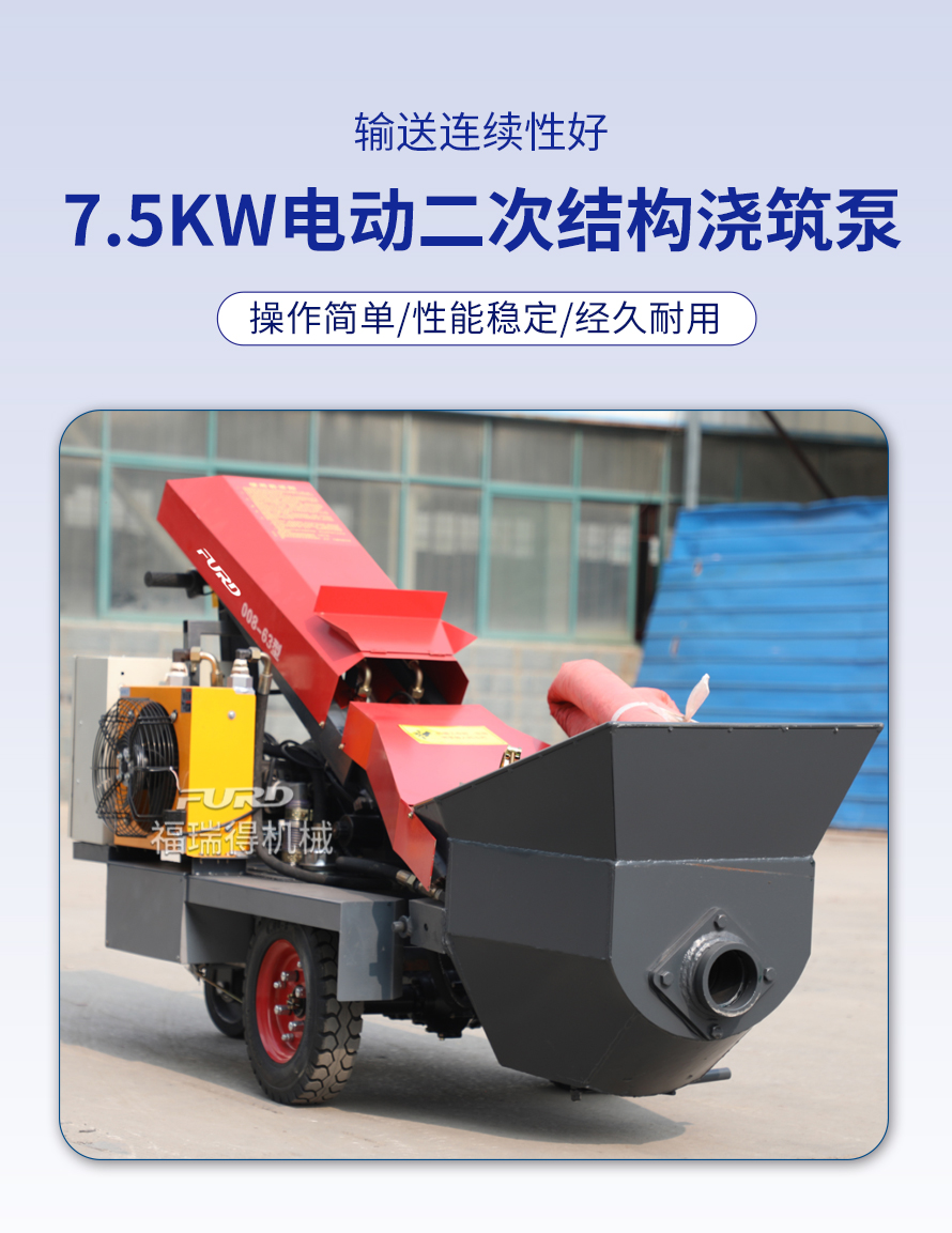 福瑞得二次結(jié)構(gòu)澆筑泵適用于商品房、農(nóng)村建房,打二次構(gòu)造柱,圈梁等,是您澆筑的好設(shè)備。電機功率小,體積小,重量輕,料斗可升降,真正能提高您的施工效率,是人工澆筑的幾十倍。