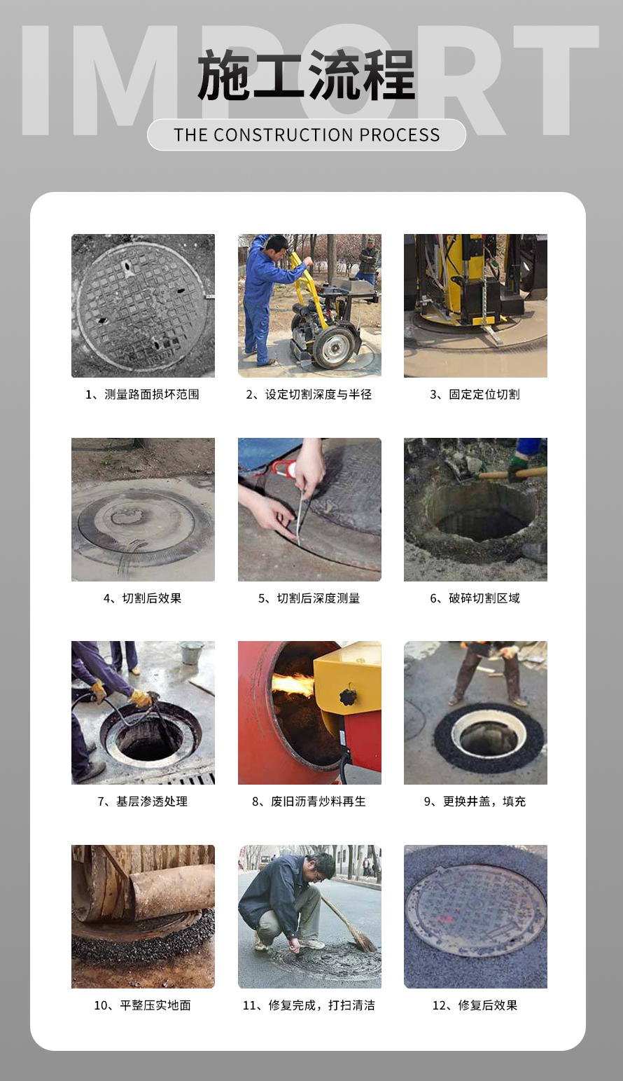 專門用于對城市道路中機動車道等井蓋周圍的水泥混凝土或瀝青路面進行圓形切割。為清楚井蓋周圍的破損路面提供分割區(qū)域,修復(fù)后的地面美觀,延長了路面的使用壽命。