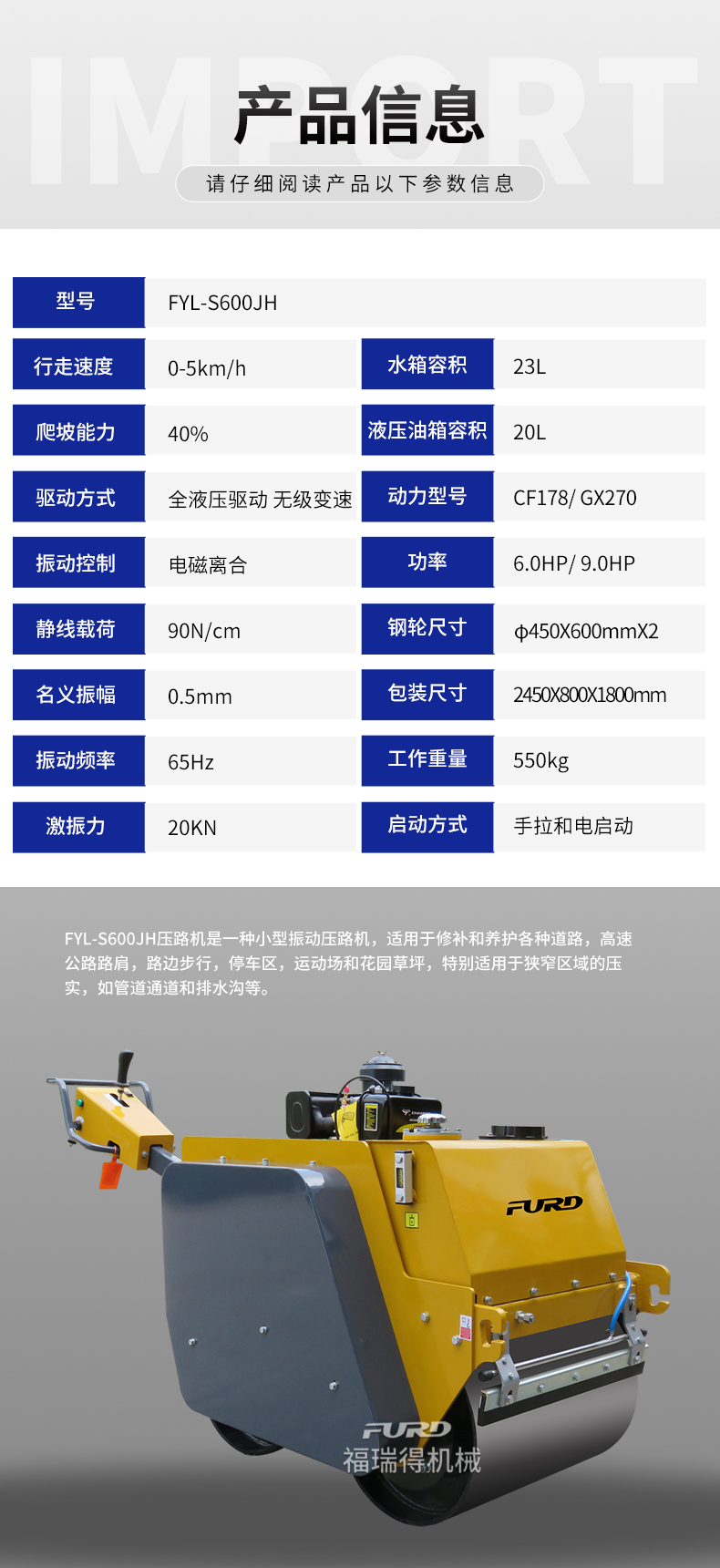 FYL-S600JH全液壓手扶及雙鋼輪壓路機